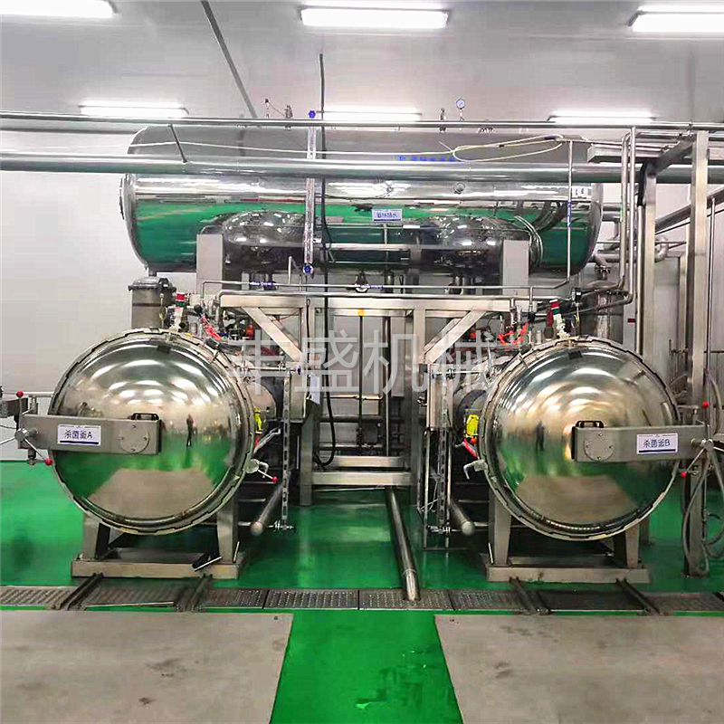 某些杀菌锅被设计成仅使用少量的水,这些水在杀菌过程中并未完全浸没容器,而是在容器上进行喷雾或喷淋。其中一种类型的杀菌锅是从杀菌锅底部将水抽出,并通过杀菌锅顶部和中部的水喷雾喷嘴将水重新导入锅内对容器进行加热或冷却。