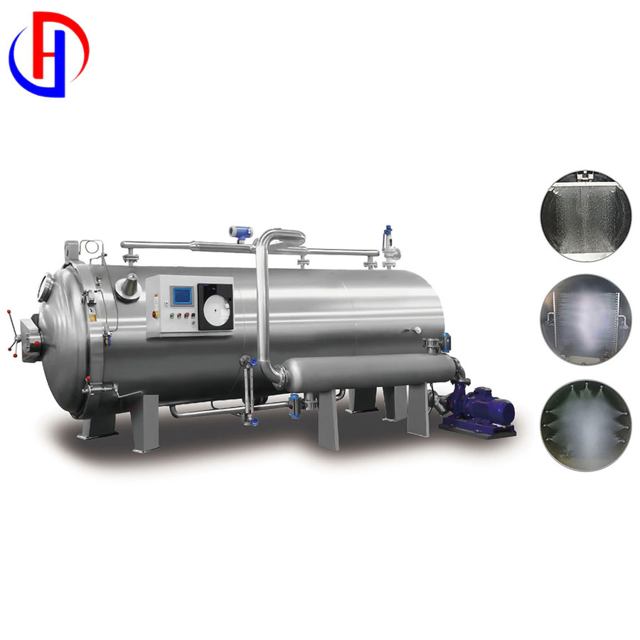 侧喷喷淋式灭菌锅杀菌方式 就现状而言,这种结构形式的杀菌釜是专门为充气包装的产品所开发出来的,其加热方式是从侧面喷淋出循环水对被杀菌产品进行加热或冷却。由于所有循环水几乎都是同时喷淋出来的,所以各处产品所获得的温度也相同,基本上可以不考虑温度分布不均匀的问题。在侧喷淋杀菌釜的工作过程当中,罐内的循环水和产品所占据的容积还不足50%,大部分空间是气体,所以杀菌罐内的压力调整就很容易,换言之杀菌罐内的压力可以按设置要求精确控制,这对充气的铝箔袋来讲是十分有利的。