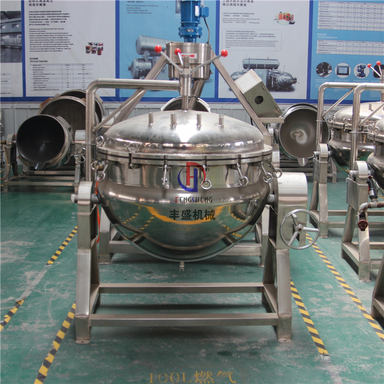 有的客户是专门给市场、酒店、餐馆、学校食堂等供蔬菜汤、鸡汤、鸭汤等配餐,一般份数比较多,产量比较大,那么就需要用夹层锅来进行熬煮是很方便的了,夹层锅有立式和可倾式的,1000L的夹层锅我们就建议用电动可倾,因为锅内盛满食品后会比较重,人力可倾的话可能会比较吃力。夹层锅还带有搅拌功能,刮底搅拌既能防止糊锅,还能兼顾将锅内